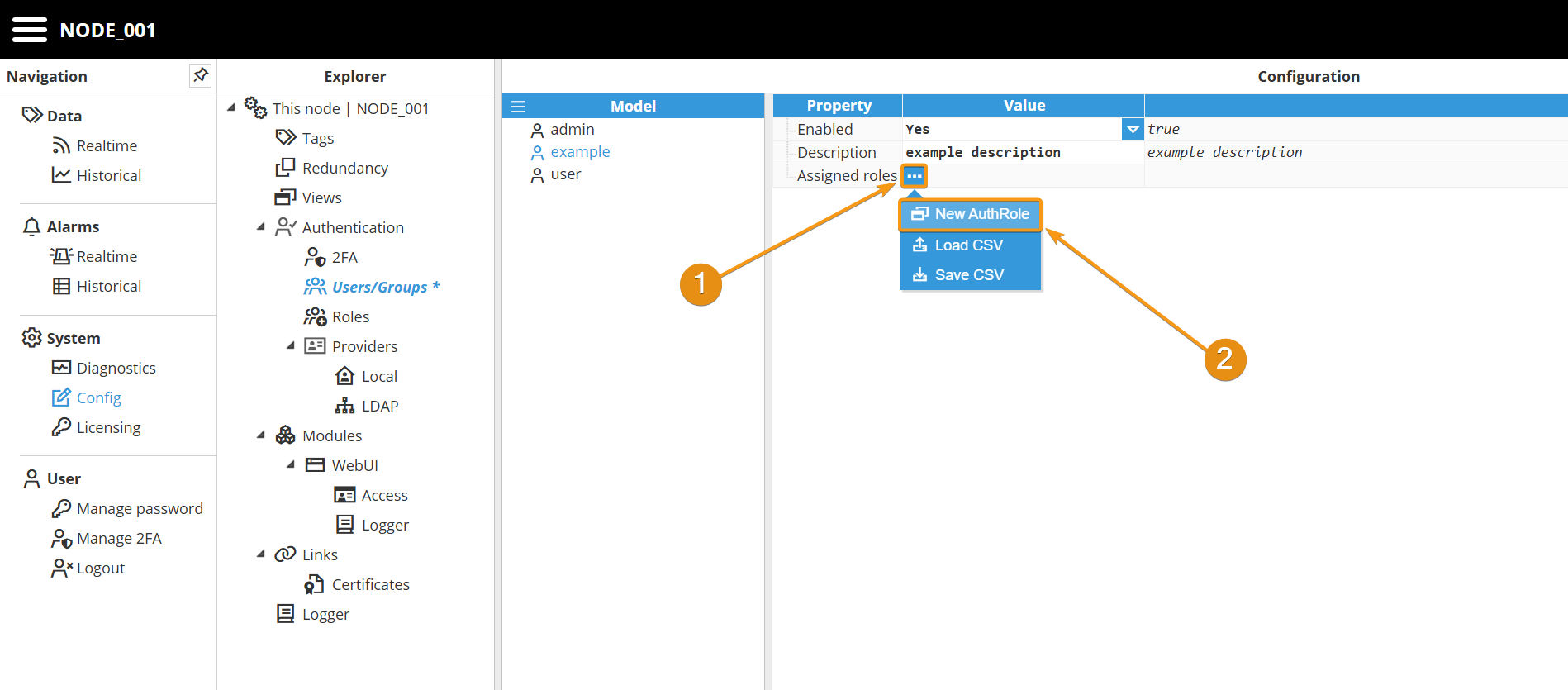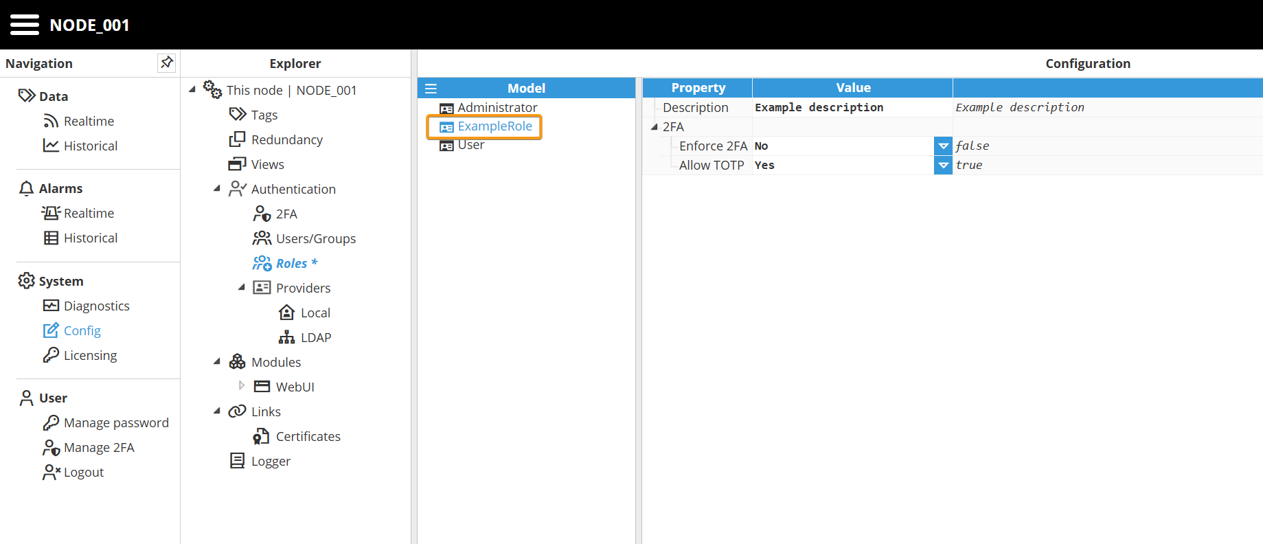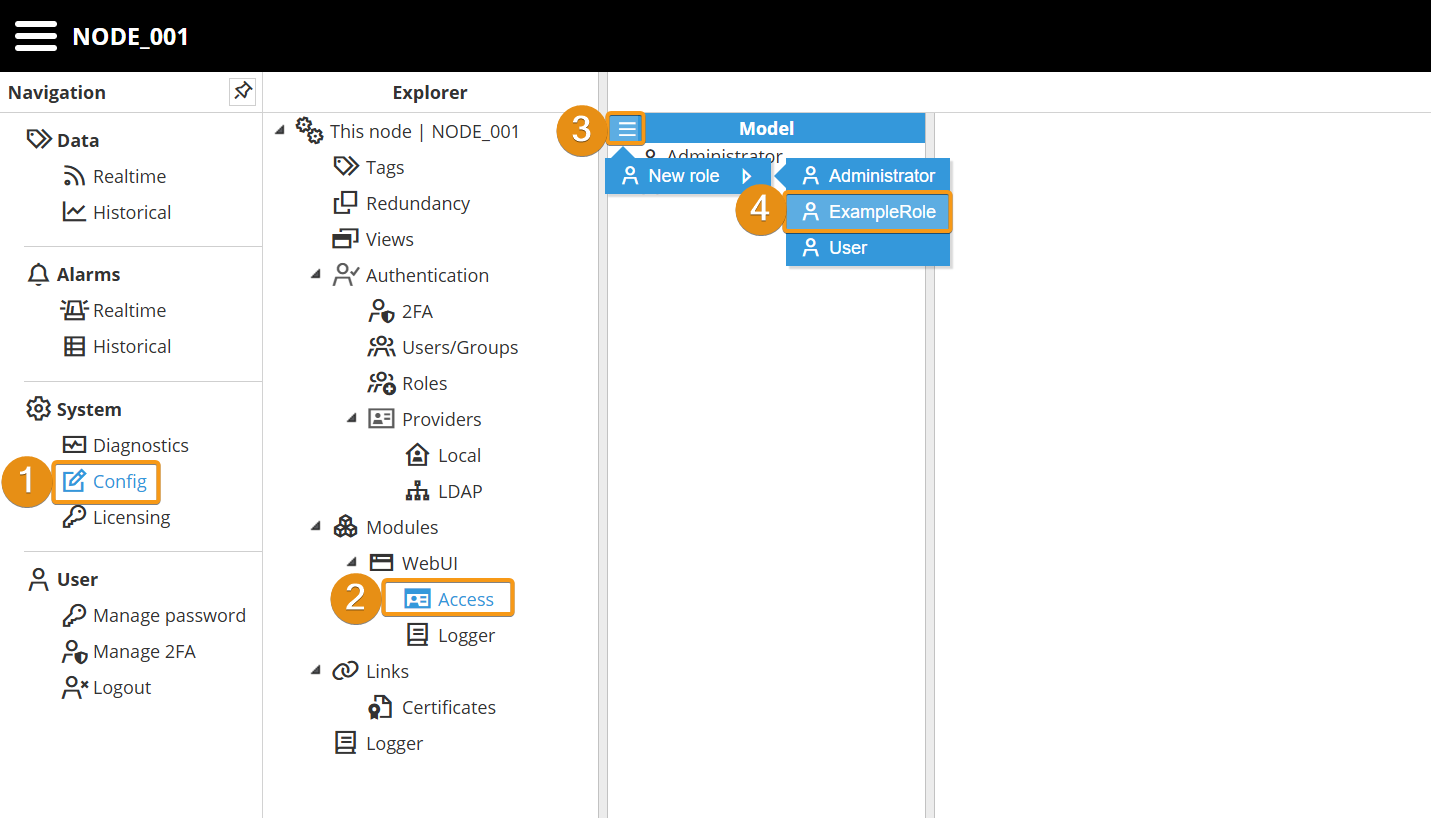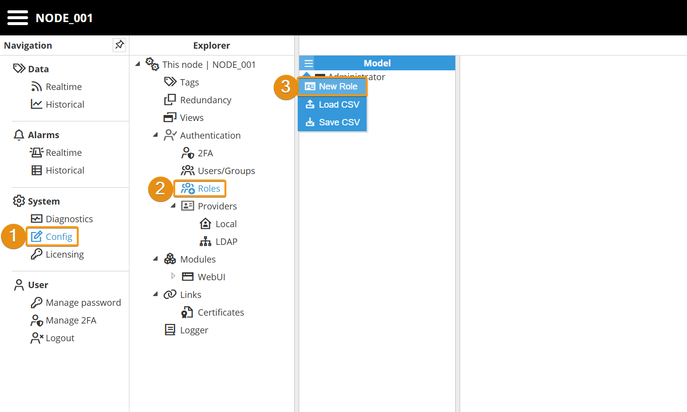 Step 1: Navigate to System → Config. In the Explorer panel, select This Node and then click Roles. Next, click the button on the left-hand side of the Model header and select New Role.
