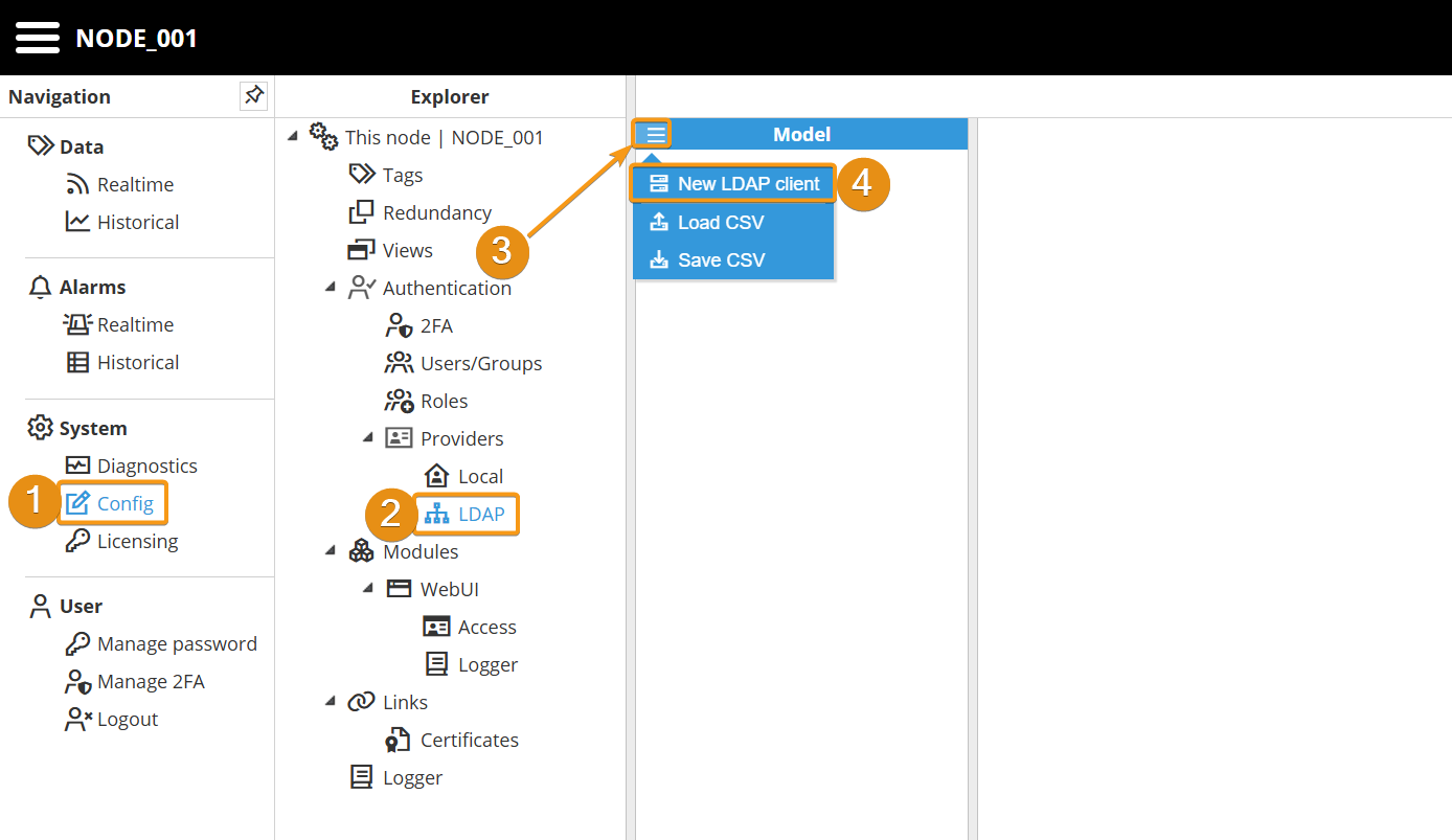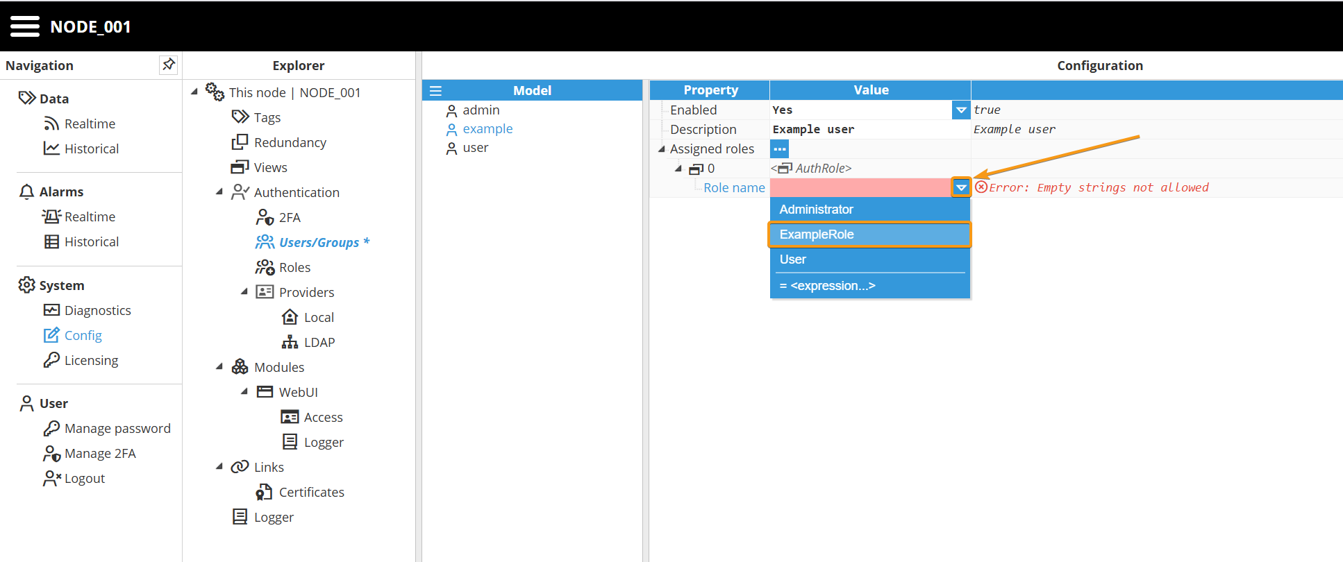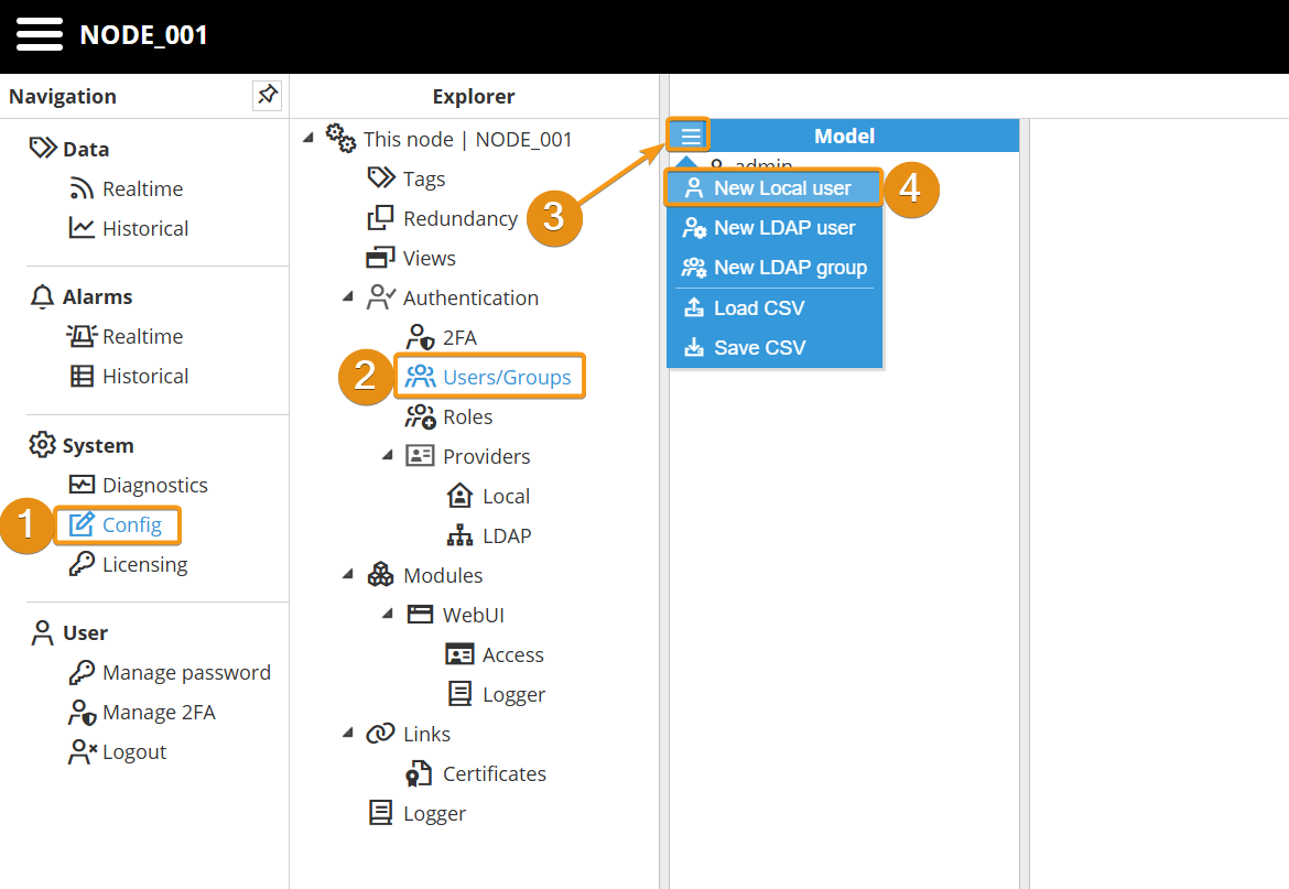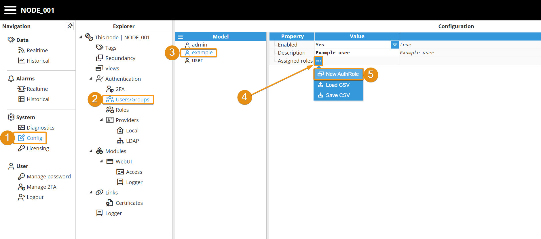 Step 1: Navigate to System → Config. In the Explorer panel, select This Node and then click Roles. Next, click the button on the left-hand side of the Model header and select New Role.