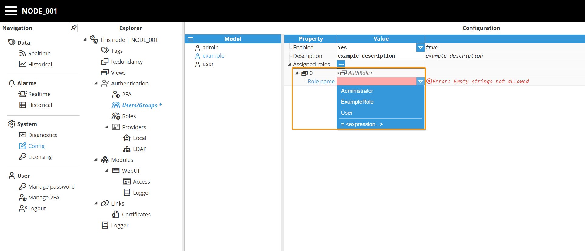 When the LDAP Provider is enabled, user and role administration is performed entirely within Active Directory and is not managed from within N3uron. As a result, adding new users or modifying existing ones requires changes to be made directly in Active Directory, typically by an Active Directory administrator.
