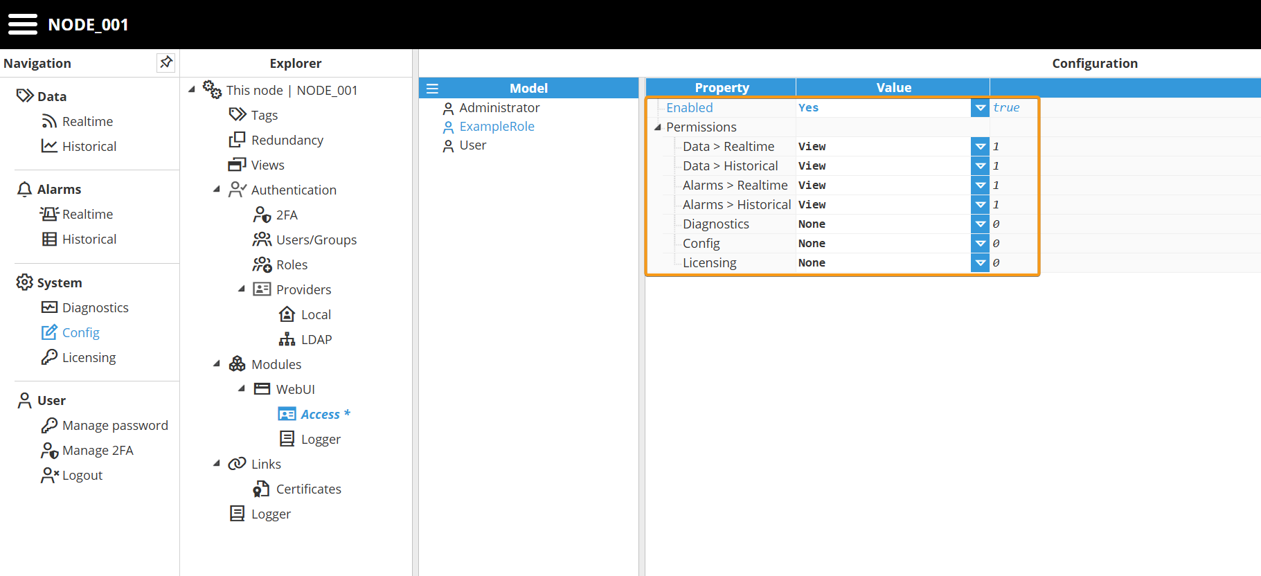 In the configuration example below, access is granted to Realtime and Historical data for both tags and alarms, while access to Diagnostics, Configuration, and Licensing is denied.